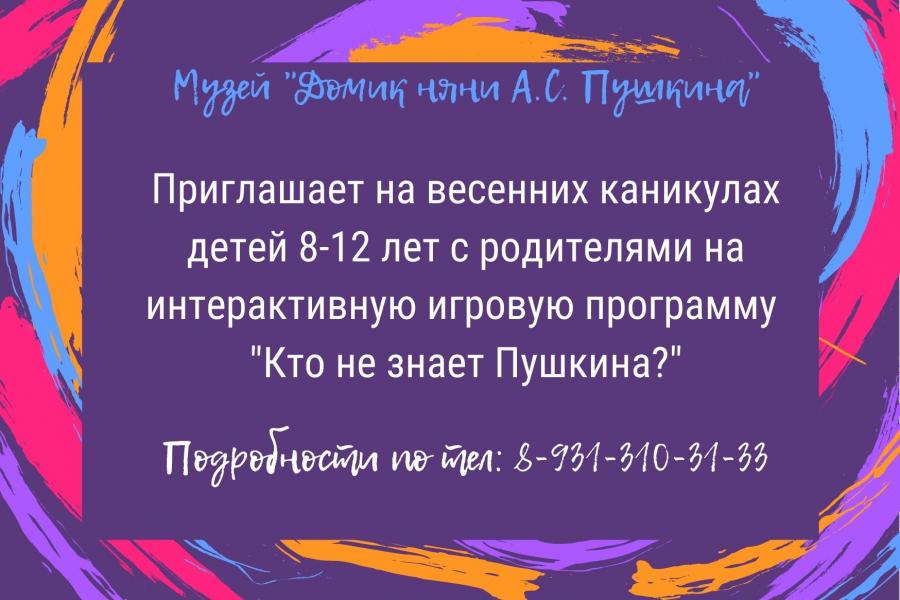 Музей «Домик няни А.С. Пушкина» был открыт 3 июля 1974 году. Автор экспозиции — старший научный сотрудник Всесоюзного музея А.С. Пушкина Нина Ивановна Грановская. Изба была выделена семье Арины Родионовны господами Ганнибалами – Пушкиными за ее хорошую службу в 1795 году. Здесь она жила с мужем и детьми (Егором, Надеждой, Марией и Стефаном) всего 3 года. Из поколения в поколения в этой избе жили родственники Арины Родионовны.