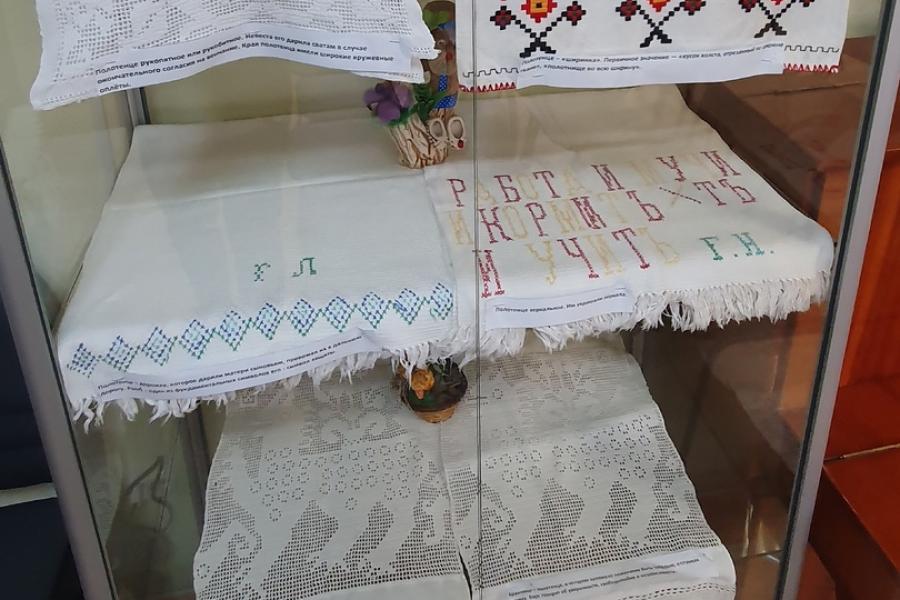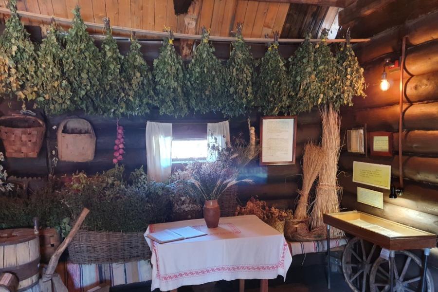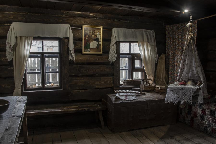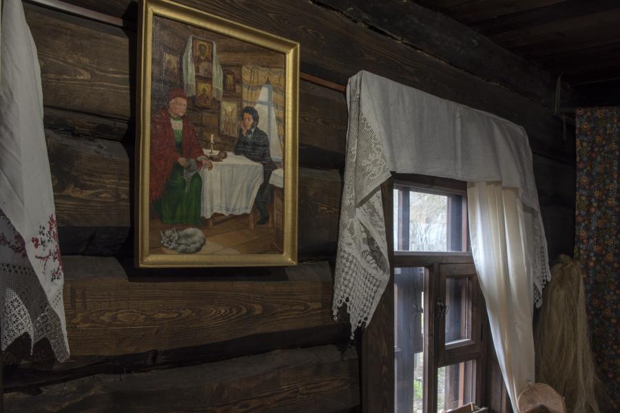 Бытовая экспозиция, построенная на подлинных старинных материалах, посвящена Арине Родионовне и представляет убранство крестьянской избы конца XVIII – начала XIX веков, времени, когда здесь жила няня великого поэта. Войдя в сени, люди попадают в сказочную атмосферу: с потолка свисают веники, засушенные цветы, лекарственные травы. Аромат растений создает неповторимый колорит избы. Внимание людей привлекают орудия труда, средства передвижения, старинный ларь. Переступая высокий порог, посетители попадают в горницу. 1\4 помещения занимает русская печь. В красном углу — икона «Знамение Божьей матери», стоит деревянный стол. Вдоль стен находятся скамейки. На матице висит колыбелька. На сундуке лежит первый русский утюг — скалка и рубель, у окна — прялки. На стене висит красный сарафан и белая кофта — праздничный наряд крепостной крестьянской женщины, рядом сумочка — торба, по преданию, эта личная вещь Арины Родионовны.