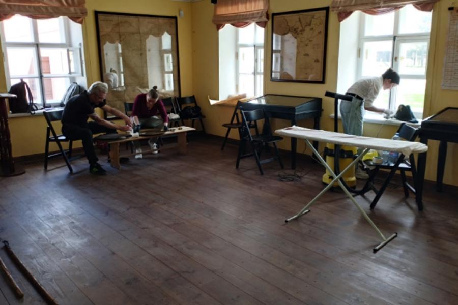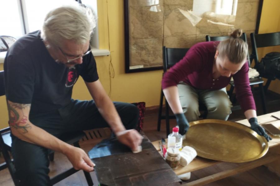 Музейные предметы требуют большого внимания и бережного ухода. Мы стараемся сохранить экспонаты, поддерживаем температуру и влажность в экспозиции и фондохранилище, ежедневно протираем пыль, а раз в месяц устраиваем санитарные дни - проводим генеральную уборку. Но, несмотря на все принимаемые меры, налёт времени не щадит предметы. И сегодня на помощь сотрудникам музея пришли профессионалы, которые устроили реставрационные мастерские в походных условиях! Проведя осмотр музейных предметов, мастера своего дела отобрали те, которые можно привести в достойный экспозиционный вид без специализированных мастерских. И вот реставраторы ткани бережно разглаживают складки на нежных, кружевных митенках, убирают пыль с тяжёлого овчинного тулупа и головного убора смотрителя. Специалисты по металлу очищают латунные подносы, кованные ухваты и сундук с прорезным узором. Мы говорим спасибо специалистам Международного центра реставрации, которые помогают нашему музею сохранять жизнь экспонатов. Это прекрасный подарок ко Дню Музеев.