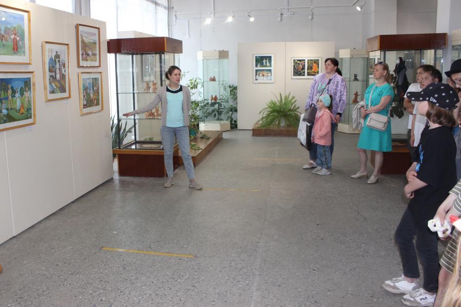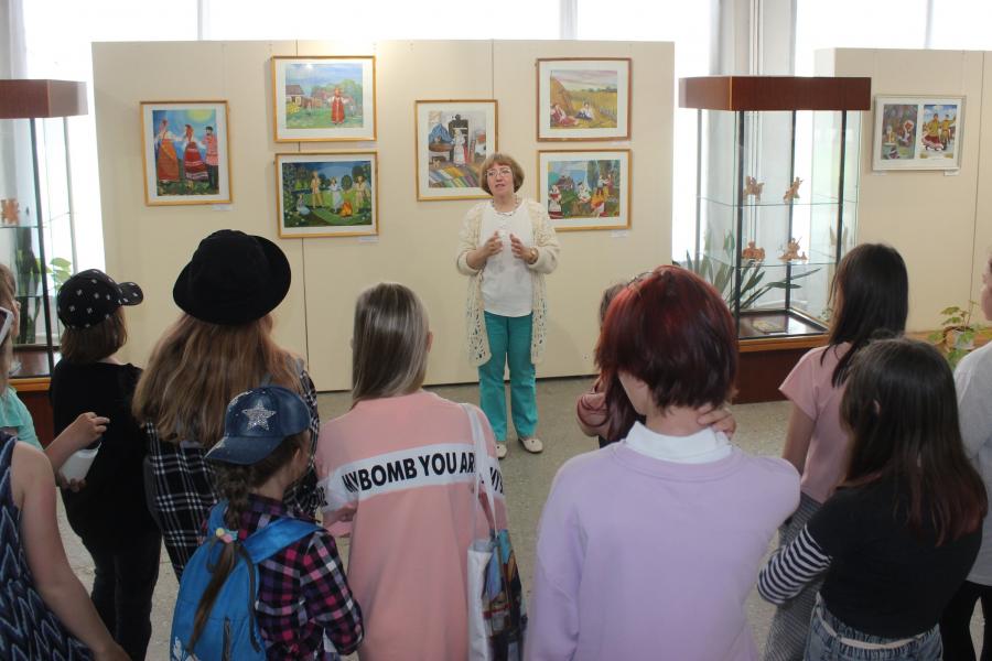 Войдя в выставочный зал, ребята с интересом принялись рассматривать живопись, графику и декоративно-прикладные работы, посвященные героям народных сказок, известным историческим личностям, защитникам Отечества.