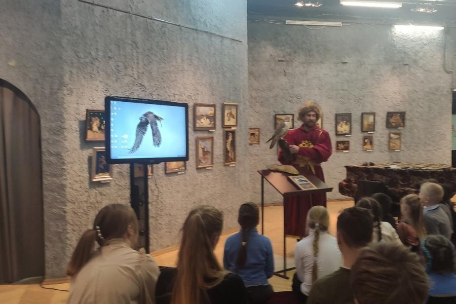 В выставочном зале музея-заповедника состоялось знакомство с сокольничим Вадимом Аводневым и его соколихой Красоткой. Зрителями и участниками мероприятия были родители с детьми.