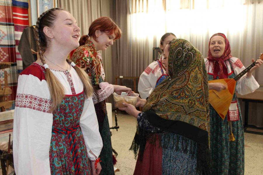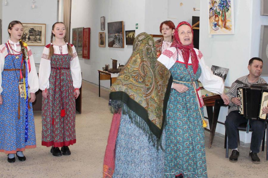В исполнении фольклорного ансамбля «Захожье» Киришской школы искусств (руководитель А.А.Аверина) и семейного фольклорного ансамбля «Киришские напевы» (руководитель М.Б.Муравлёва) прозвучали заклички, народные песни и масленичные сказки.
