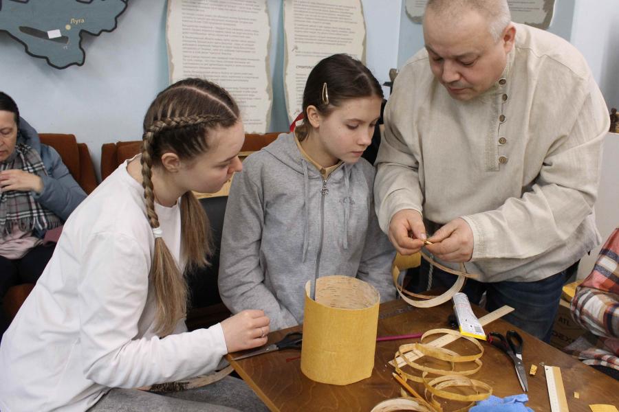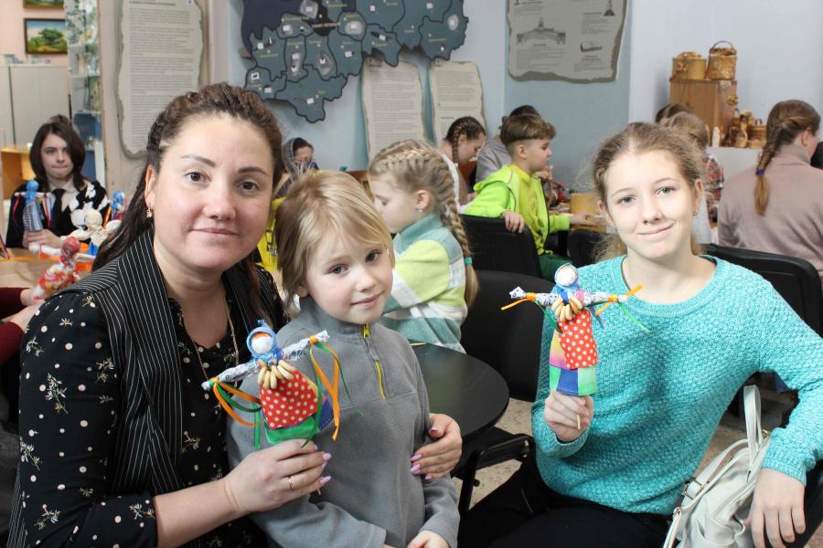 Затем под руководством мастера берестяных дел Алексей Крутских и мастерицы обережных кукол Любовь Вдовина все желающие изготовили масленичный сувенир.