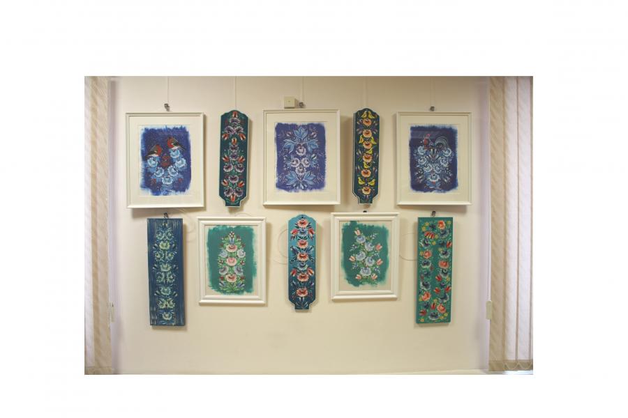 На выставке представлены работы художника, мастера карельской росписи Любови Егоровой и её ученицы Татьяны Королевой. В основном это верхние части прялок, шкафчики для кухонной мебели, окна, а также композиции выполненные на бумаге.