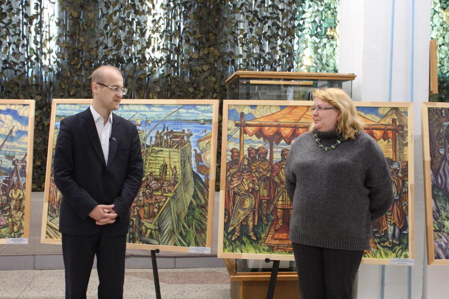 На открытии выставки экскурс в историю XIV-XV веков по картинам художника В.Зенина провел главный библиотекарь отдела краеведения Ленинградской областной универсальной научной библиотеки Леонид Михеев.