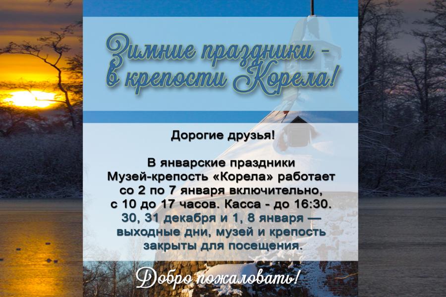 В новогодние праздники музей-крепость "Корела" работает со 2 по 7 января включительно с 10:00 до 17:00, касса - до 16:30.