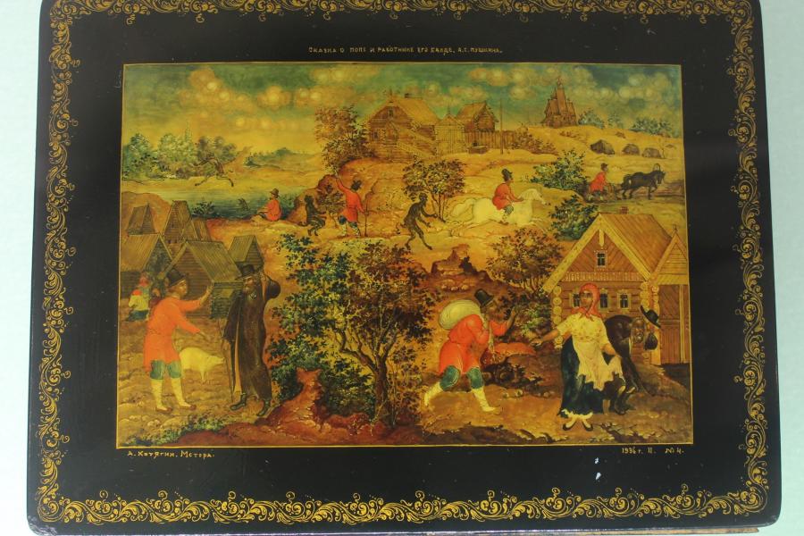 Одним из центральных экспонатов выставки является панно с сюжетом сказок, выполненное художником палехской школы В. А. Паниным. Фантазия художника вслед за котом учёным ведёт нас по тропинкам Лукоморья.