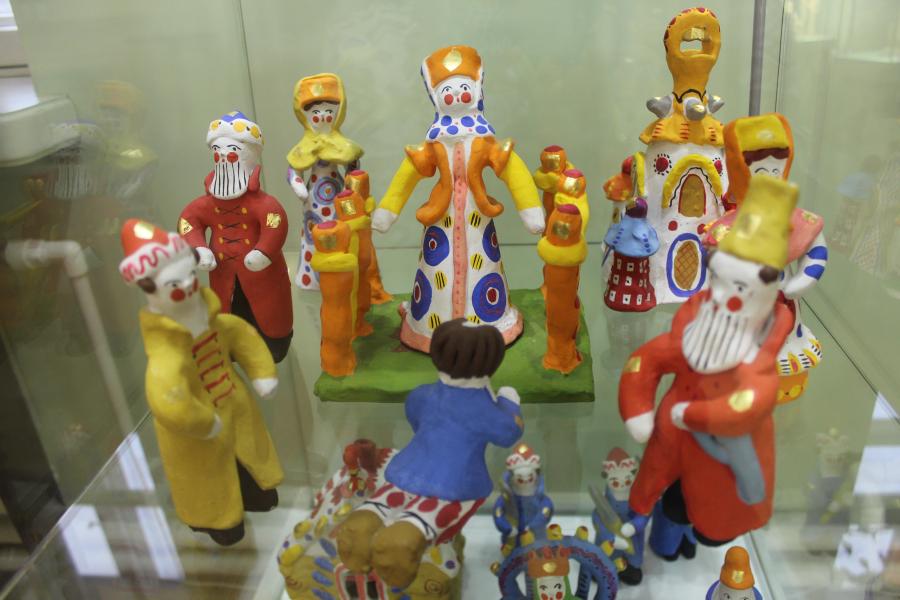Сказочные сюжеты Пушкина воплотились и в дымковской игрушке. На выставке можно увидеть цикл произведений З. В. Пенкиной к "Сказке о рыбаке и рыбке".