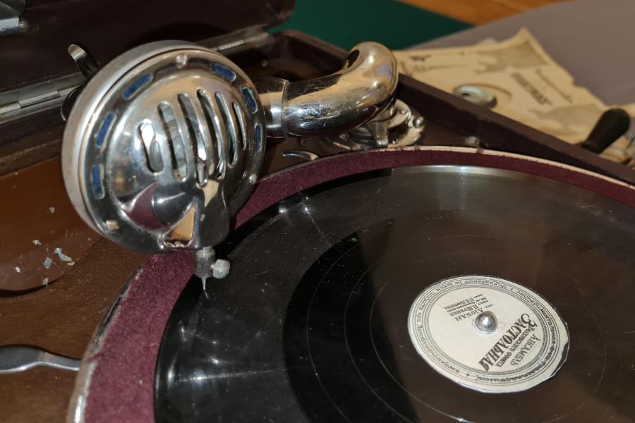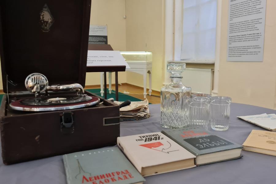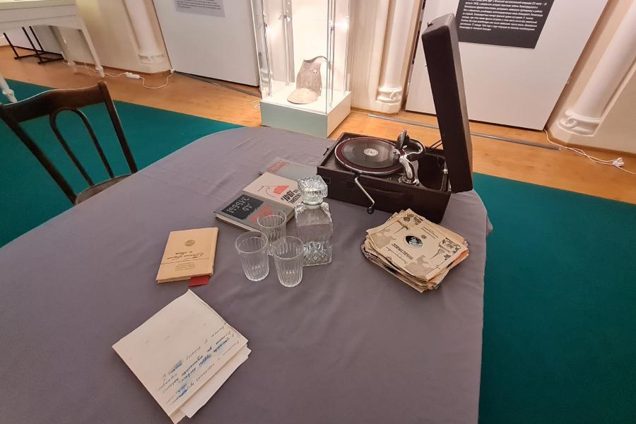 Важный смысловой акцент выставки - интерактивная инсталляция "Застолье", в ней может поучаствовать каждый. Она содержит настоящий заводящийся патефон и пластинки "Волховской застольной". Инсталляция рассказывает про послевоенные встречи ветеранов, на ней представлены предметы 1950-х годов.